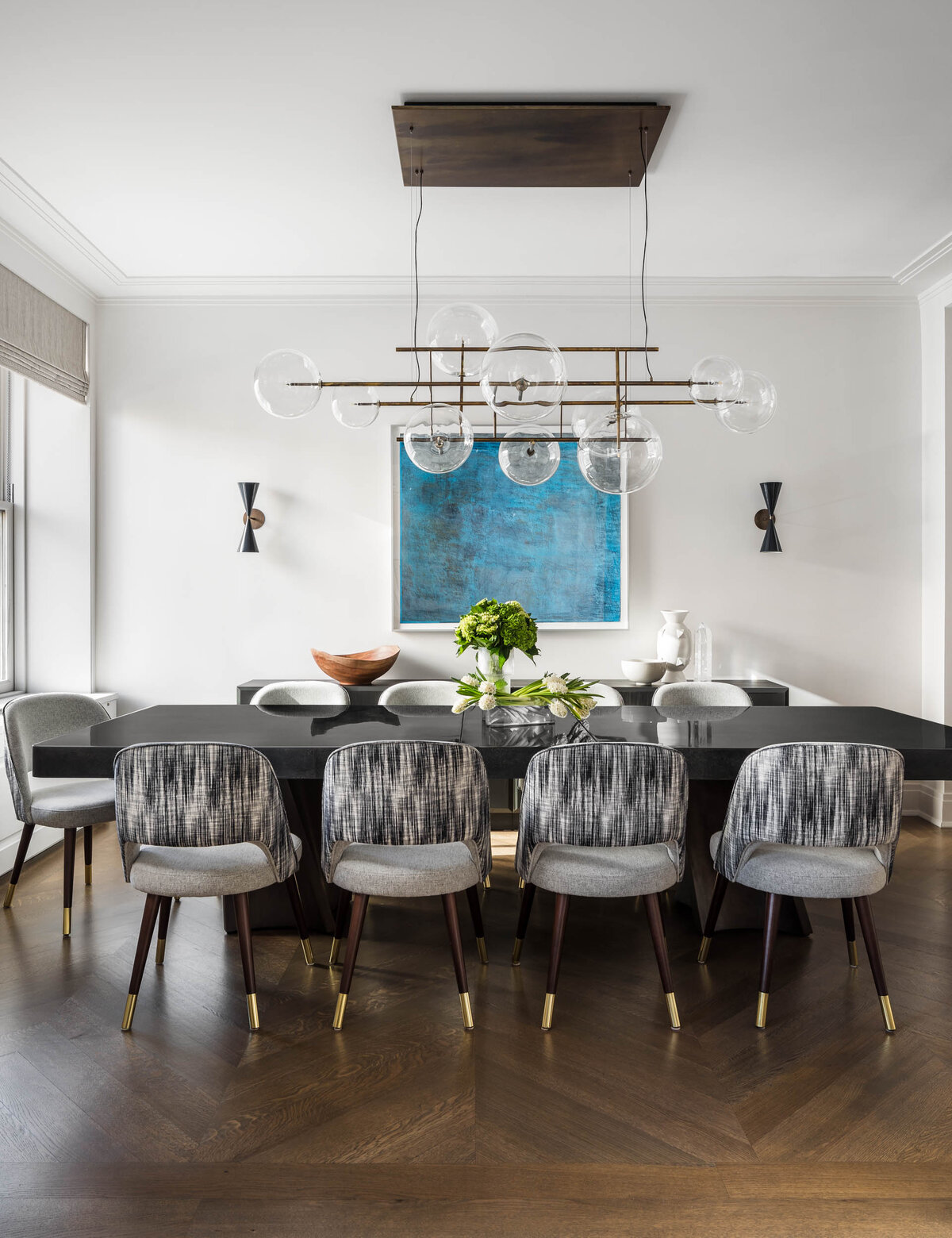 Link to Photo3, Formal dining room with dark wood table, velvet dining chairs, and a vibrant ocean blue painting