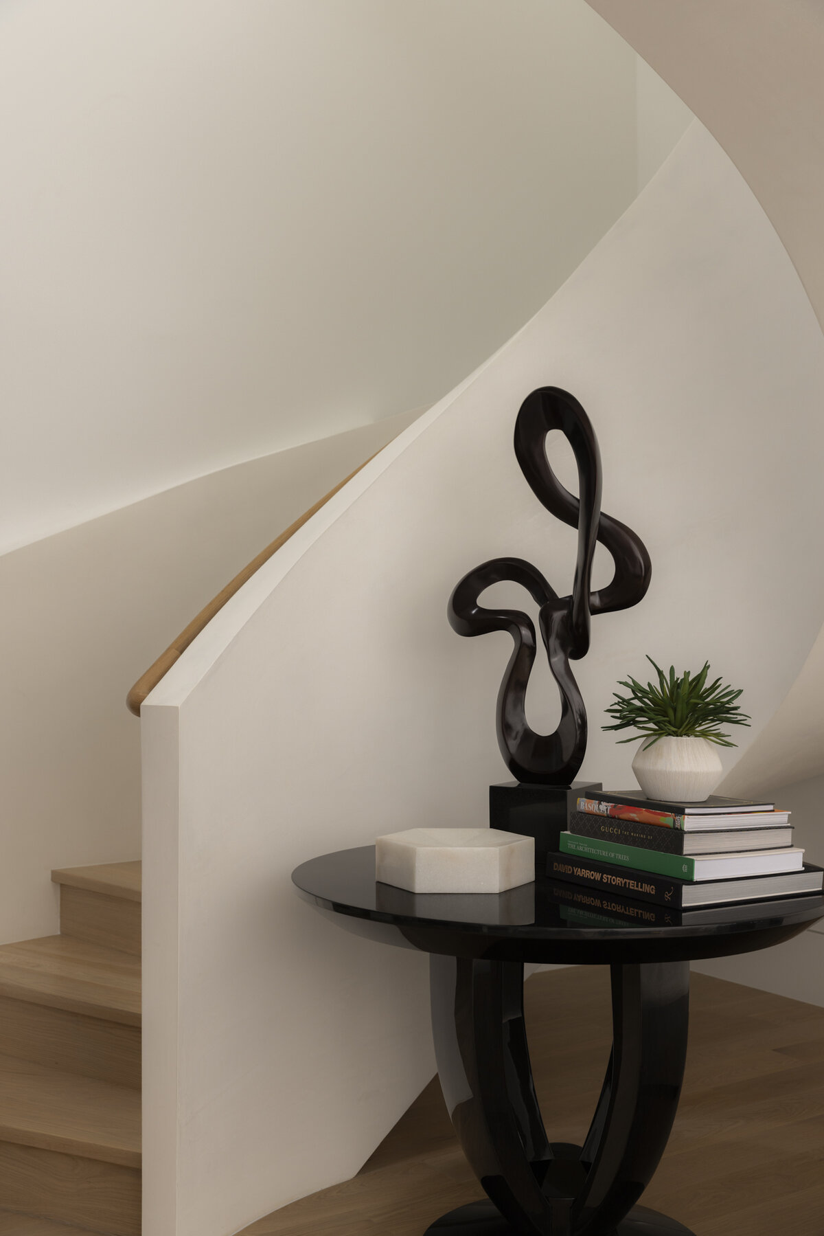 Link to Photo5, a spiral staircase with a table and a vase on top